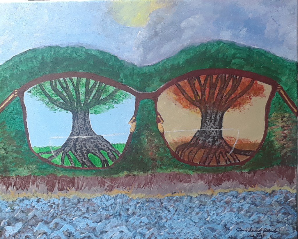 Acrylic painting shows two views through one pair of glasses: a tree in summer and a tree in winter.