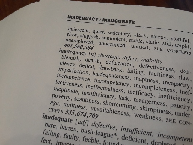 The word of the day is inadequate. By Teresa Swartz Roberts Blog post 35. Copyright 2020 The word of the day is inadequate. It’s a word I use to describe myself sometimes, particularly when I’m meeting with the social worker/counselor who works with my general neurologist’s office. I am inadequate. It can be a dark … Continue reading On inadequacy